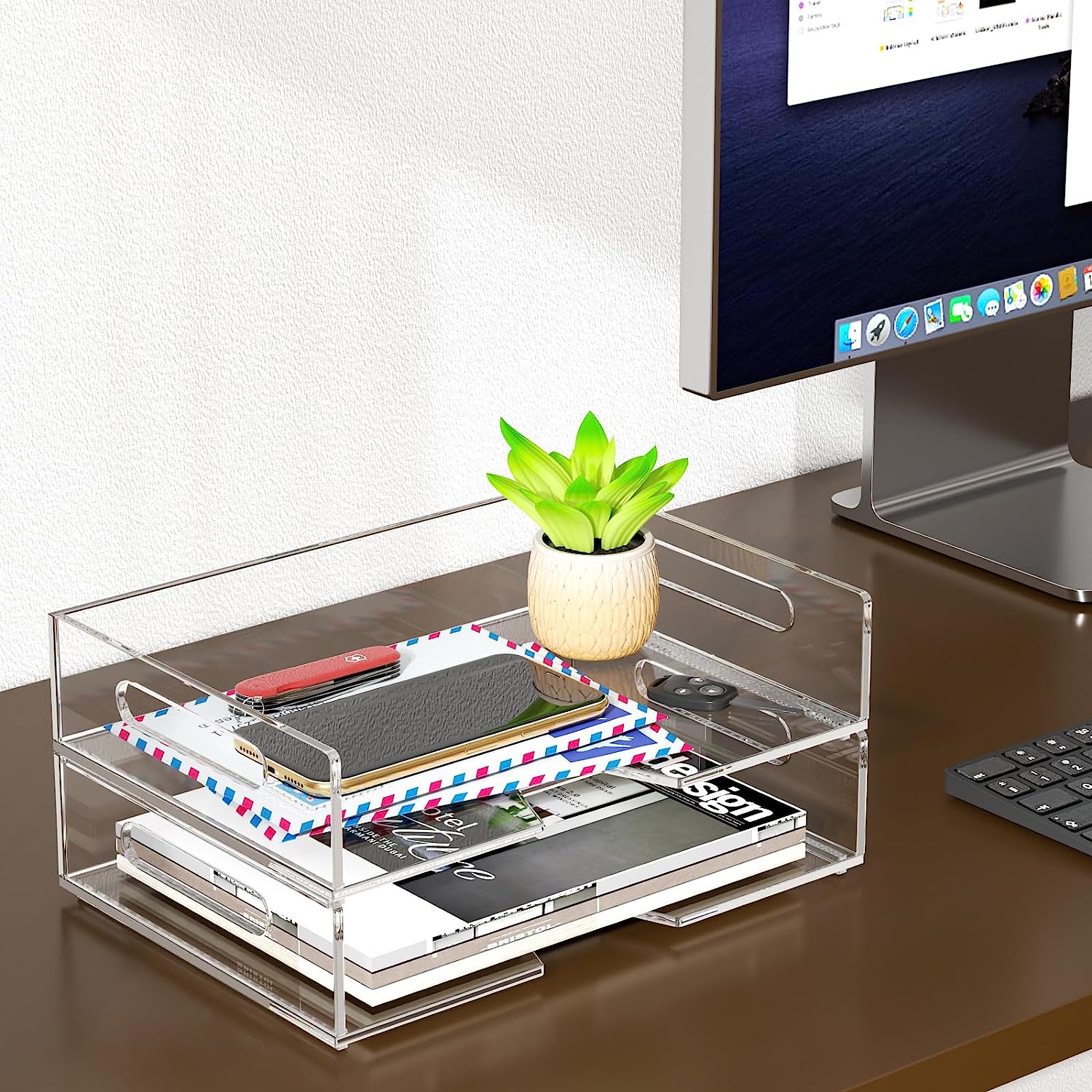 - 2 Pack Acrylic Paper Tray: Each package come with 2 pack horizontal stackable tray which measures is 8.7x12.3x2.7 inches.